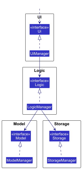 For example, the Logic component defines its API in the Logic.java interface and implements its functionality using the LogicManager.java class which follows the Logic interface. Other components interact with a given component through its interface rather than the concrete class (reason: to prevent outside component’s being coupled to the implementation of a component), as illustrated in the (partial) class diagram below.