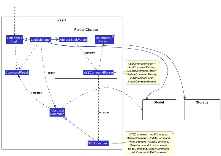 AddressBookParserclass creates anXYZCommandParser(XYZis a placeholder for the specific command name e.g.,AddCommandParser) which uses the other classes shown above to parse the user command and create aXYZCommandobject (e.g.,AddCommand) which theAddressBookParserreturns back as aCommandobject. - All