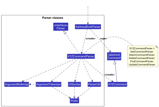 XYZCommandParserclasses (e.g.,AddCommandParser,DeleteCommandParser, …) inherit from theParserinterface so that they can be treated similarly where possible e.g, during testing.